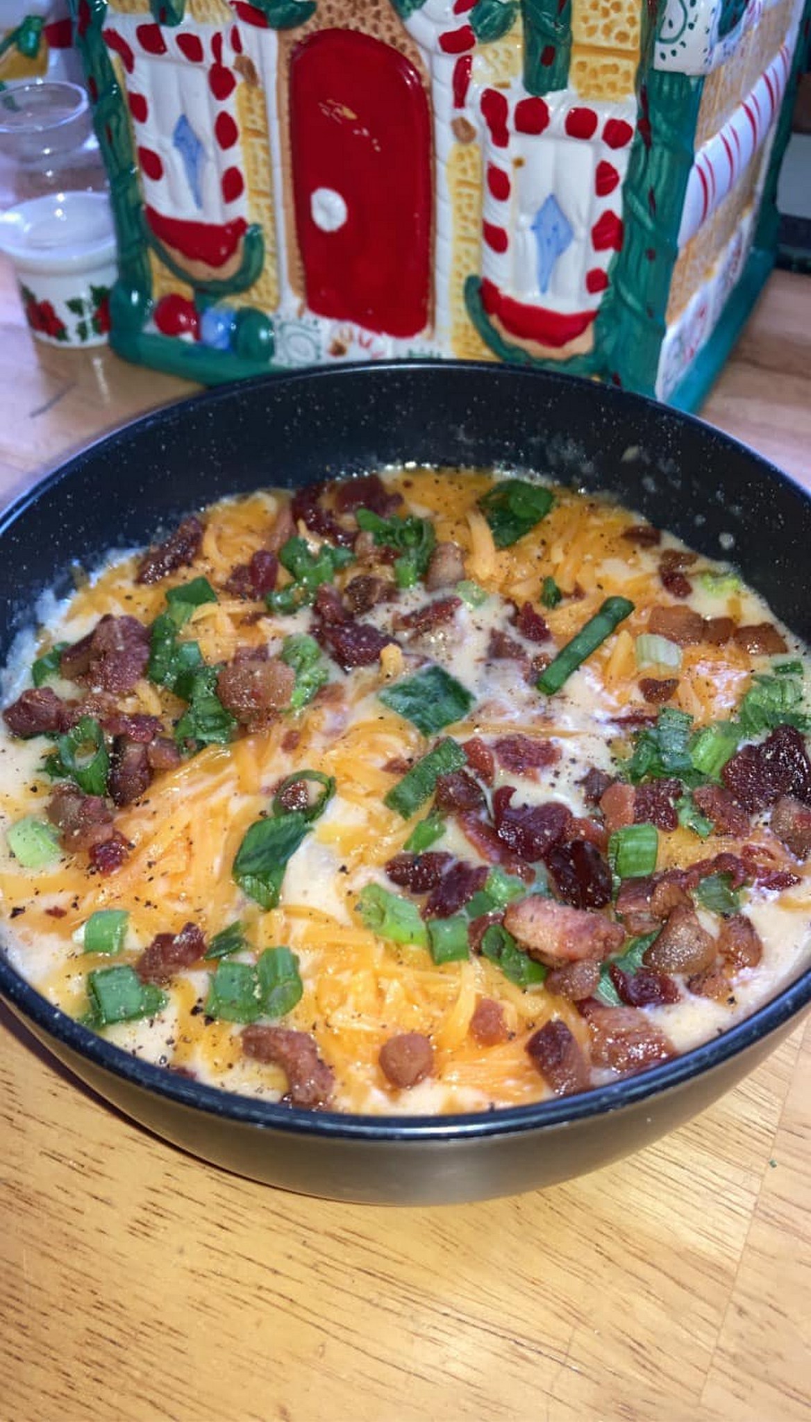 Topped off with green onion, bacon bits and mild cheddar! Enjoy